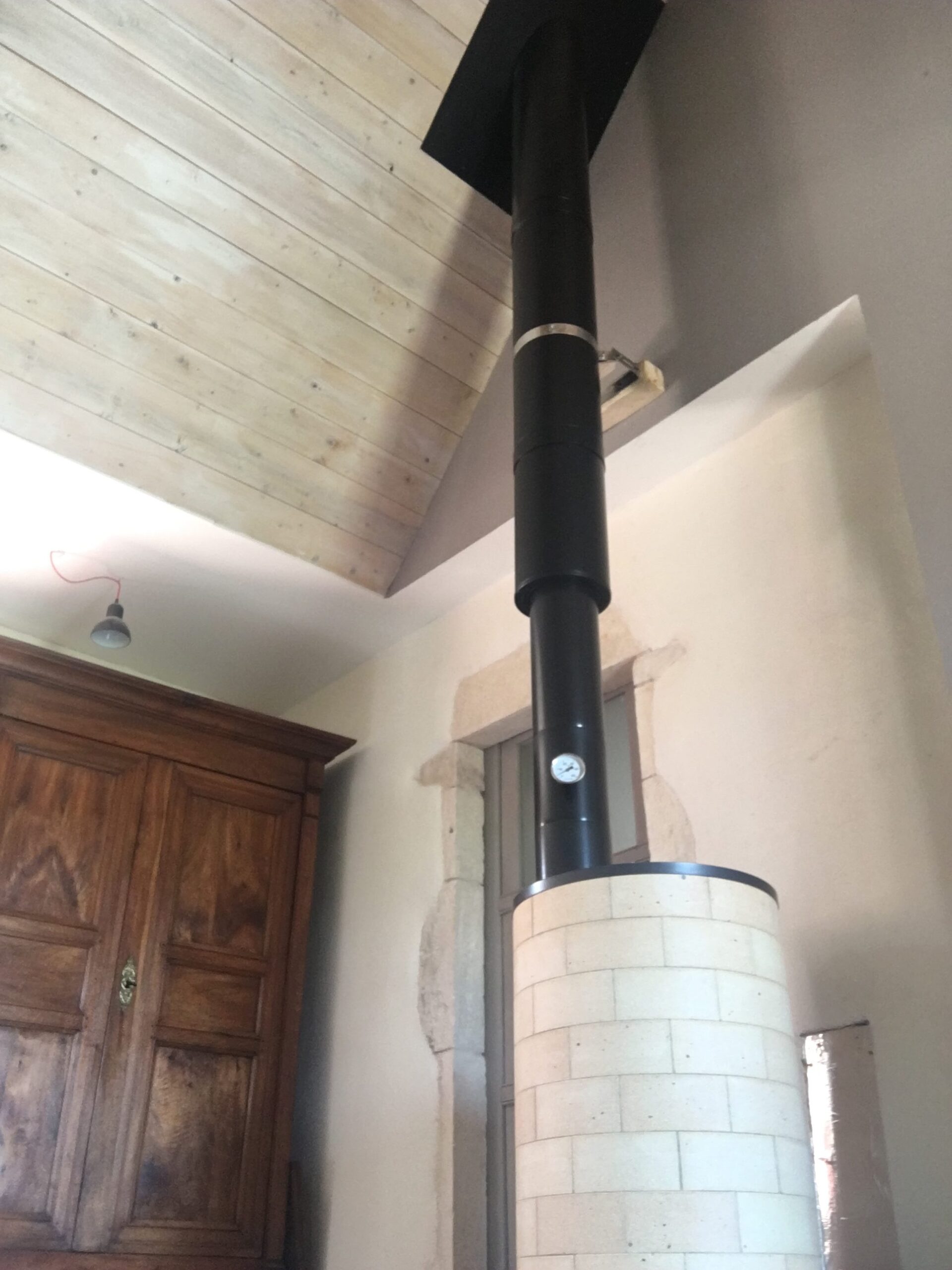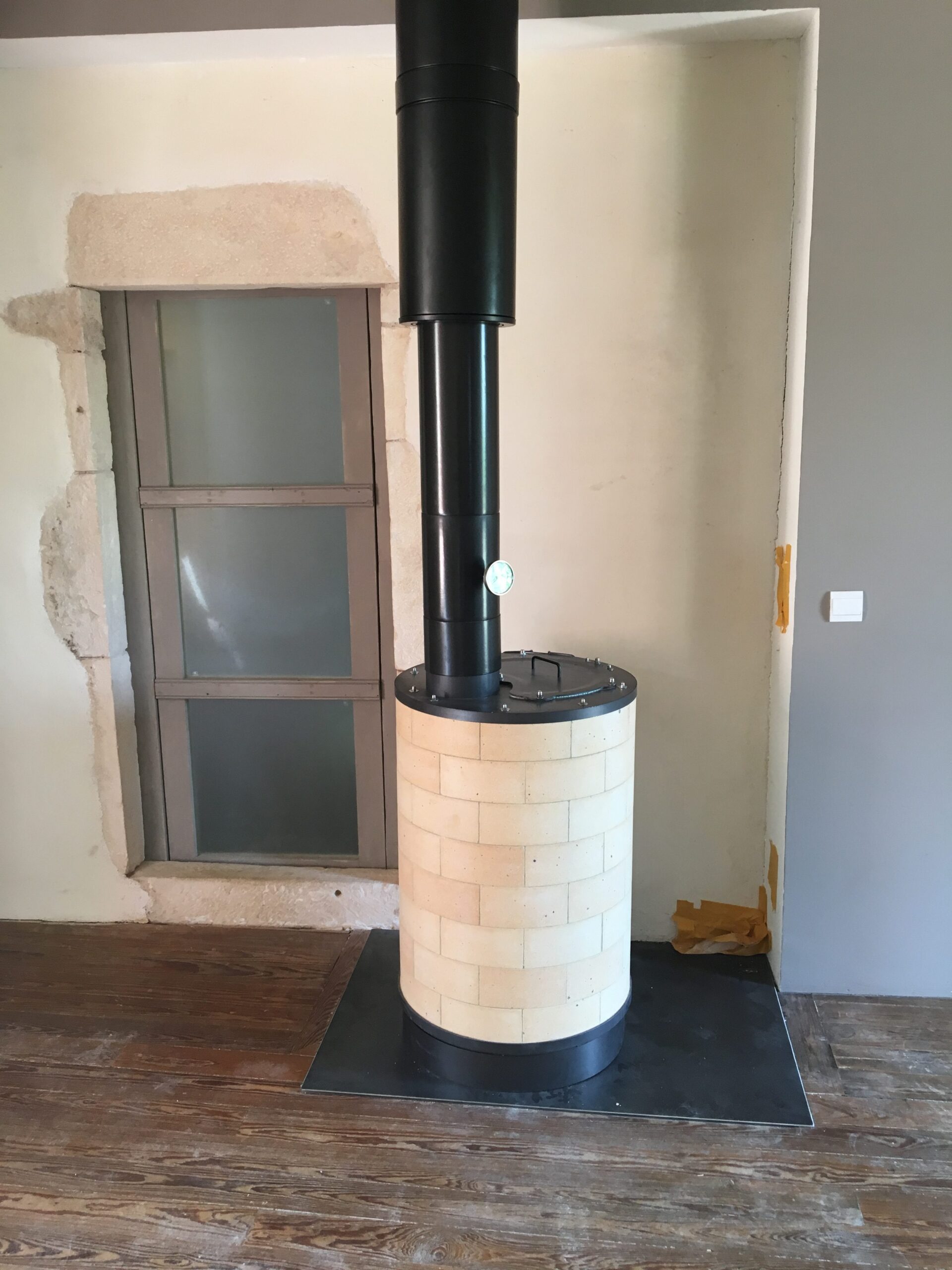 Spécificités : Pose du poêle de masse Rimandoule sur le carrelage en terre cuite et pose du satellite sur une plaque en acier afin de protéger le plancher bois. Création du conduit des fumées.